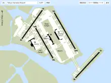 A third terminal for international flights was completed in October 2010. The cost to construct the five-story terminal building and attached 2,300-car parking deck was covered by a private finance initiative process, revenues from duty-free concessions and a facility use charge of ¥2,000 per passenger. Both the Tokyo Monorail and the Keikyū Airport Line added stops at the new terminal, and an international air cargo facility was constructed nearby.[32][33] The fourth runway (05/23), which is called D Runway,[34] was also completed in 2010, having been constructed via land reclamation to the south of the existing airfield. This runway was designed to increase Haneda's operational capacity from 285,000 movements to 407,000 movements per year, permitting increased frequencies on existing routes, as well as routes to new destinations.[32] In particular, Haneda would offer additional slots to handle 60,000 overseas flights a year (30,000 during the day and 30,000 during late night and early morning hours).[35][36]