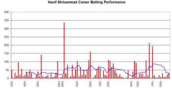 Hanif Mohammad PP (Urdu: حنیف محمد, 21 December 1934 – 11 August 2016) was a Pakistani cricketer.[1] He played for the Pakistani cricket team in 55 Test matches between the 1952–53 season and the 1969–70 season. He averaged 43.98 scoring twelve centuries. At his peak, he was considered one of the best batsmen in the world despite playing at a time when Pakistan played very little Test cricket; Hanif played just 55 Test matches in a career spanning 17 years. In his obituary by ESPNcricinfo, he was honoured as the original Little Master, a title later assumed by Sunil Gavaskar and Sachin Tendulkar.[2] He was the first Pakistani to score a triple hundred in a Test match.[3]