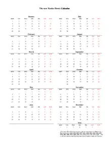 The Hanke–Henry Permanent Calendar (HHPC) is a proposal for calendar reform. It is one of many examples of leap week calendars, calendars that maintain synchronization with the solar year by intercalating entire weeks rather than single days. It is a modification of a previous proposal, Common-Civil-Calendar-and-Time (CCC&T). With the Hanke–Henry Permanent Calendar, every calendar date always falls on the same day of the week. A major feature of the calendar system is the abolition of time zones.[1][2][3]