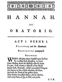The libretto begins with an "argument" that gives a summary of the story of Hannah who, through her devotion to God, was allowed to give birth to Samuel.[8] Immediately following, there is a disclaimer that reads: