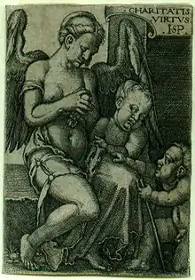 Until about 1532 his prints were monogrammed 'HSP', reflecting the Nuremberg pronunciation of his surname: Peham. After this date, by which time he had established himself in Frankfurt, his monogram became "HSB".[2] This monogram has often led to his name being given as "Hans Sebald Beham", but there is no documentary evidence for this additional forename, the "H" in the monogram probably representing the second syllable of his surname.[2][1]