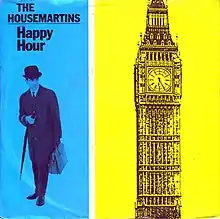 "Happy Hour" is a 1986 single by British indie rock band The Housemartins.[1] It was the third single from the album London 0 Hull 4 and reached number three in the UK Singles Chart.[2][3] Vocalist Paul Heaton had been working on the lyrics for some time, with the song originally being called "French England".[4] It was completed on 22 January 1986, the same day "Me and the Farmer" was written.[5] Guitarist Stan Cullimore had a chord progression planned for the verses, but wanted to finish the song quickly in order to go and buy some cakes, so he reused the same chords for the chorus and a quick demo was recorded, the whole process taking less than ten minutes.[4]