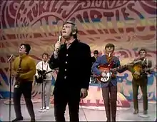 "Happy Together" was released as a single in January 1967, backed with the Warren Zevon-penned "Like the Seasons".[45][46] To promote the single, the band members performed in a couple of shows, including The Smothers Brothers Comedy Hour in February.[47][48] The Turtles would be called to perform on The Ed Sullivan Show in May 14, 1967,[49] and again, as a quintet, on November 12 (Tucker had left for personal reasons).[50][51] During this time, Douglas had left the Turtles to produce the Monkees.[33] His replacement was Jim Pons, formerly from the Leaves.[22] With Pons, they participated in a film shot in March that consisted of "the group running, jumping, rolling and mugging in a park in Los Angeles". Guitarist Tucker said in an interview that the park location was possibly Griffith Park.[52][53]
