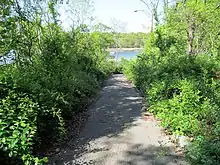 Harbor station consisted of a small shelter with no platforms; passengers boarded from a clearing next to the tracks. A paved path led from the rear of the apartment complex to the station area. Only the path and a small clearing around the concrete base of the shelter are still extant.[3]