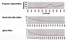 For comparison, plastic optical fibers (POF) have low bandwidths and transmission rates (typically 100 Mbit/s). They also have a high attenuation and therefore, the maximum distance is around 100 meters. Glass fibers on the other hand have very high bandwidths and transmission rates of up to GBit/s. The attenuation in glass fibres is much lower, glass fibers can cover distances of more than 10 km. Regarding bandwidth and distances, HCS fibers are situated between POF and multimode or singlemode fibers.