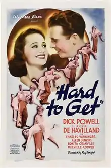 Hard to Get is a 1938 American romantic comedy film starring Dick Powell and Olivia de Havilland.[1] Written by Jerry Wald, Maurice Leo, and Richard Macaulay, and directed by Ray Enright, the film is about a spoiled young heiress who tries to charge some gasoline at an auto court and is forced by the attendant to work out her bill by making beds and cleaning rooms. Resolving to get even, she pretends to have forgiven him, and then sends him to her father to get financing for his plan to develop a string of auto courts across the country, knowing he will only be wasting his time. Hard to Get was released by Warner Bros. Pictures in the United States on November 5, 1938.[2]