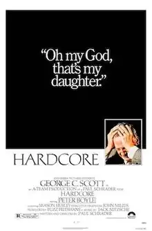 Hardcore is a 1979 American neo-noir thriller crime-drama film[1] written and directed by Paul Schrader and starring George C. Scott, Peter Boyle, Season Hubley, and Dick Sargent. Its plot follows a conservative Midwestern businessman whose teenage daughter goes missing in California. With the help of a prostitute, his search leads him into the illicit subculture of pornography and, later, snuff films.