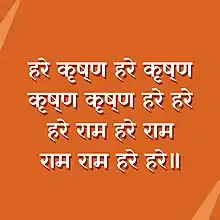 The Hare Krishna mantra, also referred to reverentially as the Mahā-mantra ("Great Mantra"), is a 16-word Vaishnava mantra mentioned in the Kali-Saṇṭāraṇa Upaniṣad.[1] In the 15th century, it rose to importance in the Bhakti movement following the teachings of Chaitanya Mahaprabhu. This mantra is composed of three Sanskrit names – "Krishna", "Rama", and "Hare".[2][3][4]