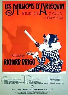 Les Millions d'Arlequin (English: Harlequin's Millions) (Russian: "Миллионы Арлекина", Milliony Arlekina) also known under the title Harlequinade (Russian: "Арлекинада", Arlekinada) is a ballet comique in two acts and two tableaux with libretto and choreography by Marius Petipa and music by Riccardo Drigo. It was first presented at the Theatre of the Imperial Hermitage Museum by the Imperial Ballet in Saint Petersburg on 23 February [O.S. 10 February] 1900. The ballet was given a second premiere with the same cast at the Imperial Mariinsky Theatre on 26 February [O.S. 13 February] 1900.
