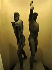 A sculptural pairing of the tyrannicides Harmodius and Aristogeiton (Ancient Greek: Ἁρμόδιος καὶ Ἀριστογείτων, romanized: Harmodios, Aristogeitōn) was well known in the ancient world in two major versions but survives only in Roman marble copies. The lovers Harmodius and Aristogeiton were Athenian heroes whose act of daring in 514 BC opened the way for Athenian democracy.