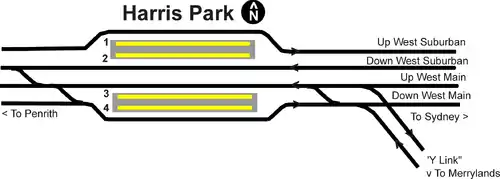 Harris Park station opened in the late 1800s.[2] Originally built as two side platforms, both were rebuilt as island platforms during the quadruplication of the Granville to Westmead line in the mid-1980s.[3] On 2 November 1996, the Harris Park to Merrylands Y-Link opened allowing direct train operation between these two stations by what is now known as the Cumberland Line.[4]