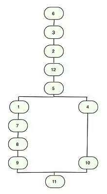 The later a context's formation is, the higher it is in the matrix, and conversely the earlier it is, the lower. Relationships between contexts are recorded in the sequence of formation, so even though wall 2 is physically higher than other contexts in section, its position in the matrix is immediately under backfill 3 and below floor 6. This is because the formation of the backfill and floor happened later. Also note the matrix splits into two parts below the construction cut 5. This is because the relationships across the section have been destroyed by the cutting of construction cut 5 and even if it is likely that layers 1 and 4 are probably the same deposit the information can not be guaranteed if the only information we had was this section. However the position of cut 5 and natural layer 11 "ties" the matrix together above and below the split in the matrix.