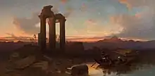 Johnson travelled in southern Europe, northern Africa and Asia Minor. He painted oil - and watercolour pictures (ruins of Sardis, the Acropolis in Athens, Temple of Athena in Aegina). In 1844 he was making one of a number of visits to Betws-y-coed in Wales - this time with David Cox of the Birmingham School who was known for painting landscapes.[2] He exhibited at the Royal Academy from 1845, and at other times in the next 35 years.[1] Johnson has watercolours in the Victoria & Albert Museum as well as paintings in collections in Bath, Sheffield and Birmingham.[3]