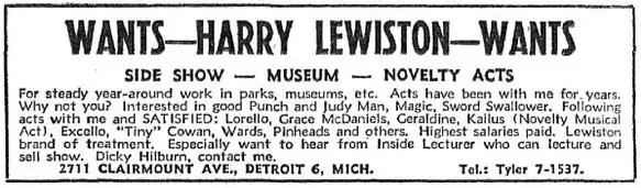 In late 1937, Lewiston and Rose left Ringling Bros. to form their own organization, and brought several circus freaks with them, including Grace McDaniels the "Mule-Faced Woman," tattooed girl Stella Grassman, Clico the African pygmy, "Human Balloon" Art Hubbell, Disco the magician, Lady Johanna the mentalist, sword swallowers John and Vivian Dunning, and Mel Burkhart the "Anatomical Wonder," who subsequently developed his "Human Blockhead" act while working in this show. Harry Lewiston's Traveling Museum (also known as "Lewiston's Big Circus Sideshow," "World's Fair Freaks," and "Palace of Oddities") featured a variety of sideshow and freak performers, a "girlie show," and snakes. Additionally, Rose managed several fortune tellers and served as the entire organization's treasurer. They initially paired up with the Conklin and Garret Shows and performed at venues throughout the United States and Canada, including the Canadian National Exhibition. Their son Eli was born in Illinois in February 1938, and later became part of the act. He was billed as the baby of two dwarfs, with advertisements featuring teasers including "Midget Couple and Normal Baby, 10-mo. old son."[3] Lewiston's python display, which included a wrestling act, was featured in a full-column article with two more columns of photos in The Charlotte Observer,[4] and an excerpt of the story even received national attention: