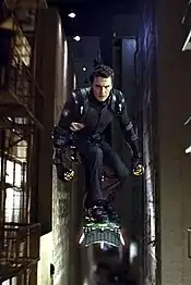 In Spider-Man 3, shooting was difficult for cinematographer Bill Pope during fight scenes that take place at night, as the symbiote Spider-Man, Venom, and the New Goblin were all costumed in black for those scenes.[5] Upon Harry taking on his father's mantle and using leftover equipment, Harry's suit and glider have been modified, possibly due to the backlash that the original Green Goblin suit received in the first film.[6] Instead of using a bulky helmet, the New Goblin uses a mask resembling a ski mask with goggles, and his glider, nicknamed the Sky Stick in the film's promotional materials, resembles a snowboard.