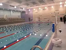 When it was built, the school housed two indoor swimming pools. An Olympic-sized competition pool, which had been closed since 1995 due to eroded pipes was reopened in January 2012. An adjacent shallow training pool, also in disrepair, was not fixed due to a lack of sufficient funds. It is now hidden from view behind a wall built during the renovation.[40][41][43][44]