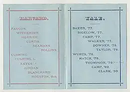 Program for the "Foot Ball Match", Harvard versus Yale, the first intercollegiate rugby football game between Ivy League teams. The two teams played with 15 players on a side.