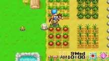 The player starts with several tools, and must earn money by clearing the large field on the farm and planting crops, mining, or foraging. This money may be used to buy other things, such as livestock, and to expand the farm. The social aspect of Harvest Moon: Friends of Mineral Town is a large part of the game. There are many villagers to befriend, and six bachelorettes available to marry. Befriending villagers allows the player to learn recipes and discover villager's histories, and marriage allows the player to have a son.[1] The game offers connectivity with the Nintendo GameCube game Harvest Moon: A Wonderful Life using a link cable between the Game Boy Advance and Nintendo GameCube.