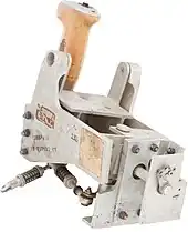 The Germans developed an electrical two-axis joystick around 1944. The device was used as part of the Germans' Funkgerät FuG 203 Kehl radio control transmitter system used in certain German bomber aircraft, used to guide both the rocket-boosted anti-ship missile Henschel Hs 293, and the unpowered pioneering precision-guided munition Fritz-X,[6] against maritime and other targets. Here, the joystick of the Kehl transmitter was used by an operator to steer the missile towards its target. This joystick had on-off switches rather than analogue sensors. Both the Hs 293 and Fritz-X used FuG 230 Straßburg radio receivers in them to send the Kehl's control signals to the ordnance's control surfaces. A comparable joystick unit was used for the contemporary American Azon steerable munition, strictly to laterally steer the munition in the yaw axis only.[7]