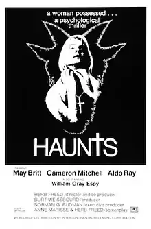 Haunts is a 1976 American psychological horror film directed by Herb Freed, and starring May Britt, Cameron Mitchell, and Aldo Ray. Its plot follows a young woman living on a farm with her uncle, whom she suspects of committing several murders of young girls in the area. The screenplay was written by Freed and his wife, Anne Marisse, and was inspired by a series of repressed memories Freed experienced after his wife witnessed a car accident.[2]