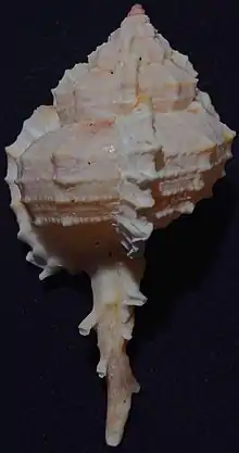 Medium shell, creamy white to brown, sometimes tinged with pink and ornamented with brown blotches. Three prominent, rounded varicies per whorl, usually spineless, but occasionally with one or two sharp spines at the base of the varicies and anteriorly on the canal. Sculptured with gemmate, spiral striae which are occasionally yellowish. Aperture white, outer lip sharply, minutely dentate.[3] The shell of an adult specimen varies between 50 mm and 80 mm.