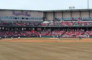 Hawks Field at Haymarket Park is a baseball stadium in the Haymarket District of Lincoln, Nebraska. It is less than a mile west of the University of Nebraska–Lincoln (NU) and is the home venue of the school's baseball team and the Lincoln Saltdogs of the American Association of Professional Baseball. The thirty-two acre Haymarket Park complex, jointly financed by the city of Lincoln and NU, was completed in 2001 at a cost of $29.53 million ($48.8 million in 2022 dollars[1]). Hawks Field is adjacent to the smaller Bowlin Stadium, which hosts Nebraska's softball team.