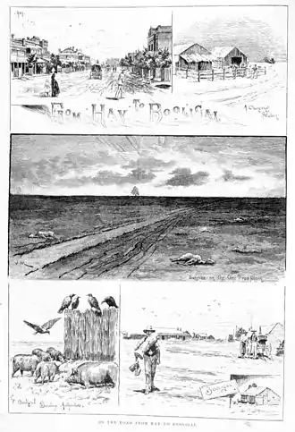 In 1888 much of New South Wales was experiencing a devastating drought, after a succession of dry years across south-eastern Australia. In early December 1888 a first-hand account of the effect of the drought on the western Riverina districts entitled 'The Riverina Drought: The Murrumbidgee to the Lachlan' was published in The Age newspaper in Melbourne. In the long article the "special reporter" describes the road between Hay and Booligal as being "sprinkled with carcases [of sheep] more or less close together all the way" and includes the following: "The drovers and teamsters who do this route reckon that it covers the hottest place known to fact and imagination, for they say the line of track is Hay, Hell and Booligal…".[6] The article was re-published in at least four Victorian and South Australian newspapers during the following week.[7]