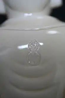 He Chaozong (Chinese: 何朝宗; pinyin: Hé Cháozōng) was a celebrated early 17th-century Chinese potter. He Chaozong fashioned mainly Buddhist white porcelain statuary in the tradition of the Dehua kilns in Fujian Province, known in the west as Blanc-de-Chine. Little documentary evidence remains for He Chaozong apart from extant examples of his ceramic art. A gazetteer entry for 1763 mentions him with other art notables of the Ming dynasty and establishes that the artist had earned a considerable reputation by his own day. His works identified by his seal are in an entirely different category than the usual Dehua statuary of the period and those later. They are thickly potted and exhibit an artistic expressiveness and creativity unmatched by thinner and standardized unsigned works. He Chaozong and the few other artists of the Dehua kilns were nearly unique in Chinese ceramic history which was characterized by anonymous and industrial scale production. Blumenfield in his Blanc de Chine presents the reader with what may be one of the few believable examples of the artist, replete with a hidden inscription visible to ultraviolet light. Of great interest is the manner of carving of the piece which shows none of the exuberant flowing robes of other examples of the master that may be simply just superficially attractive to the eye. Of additional interest in the Blumenfield book is the He Chaozong seal impressed on an additional Guanyin (p. 133) statue attributed to He Chaozong. All of the characters in the seal appear in reverse. This indicates that at least some seals on Dehua porcelain figures were akin to brands and perhaps of metal construction that could be mistakenly impressed in reverse. The outer borders of the Blumenfield seal, and the seal presented with the Manjusri statue accompanying this article, were both incised and evidently added after the characters were impressed on the bodies of the figures.