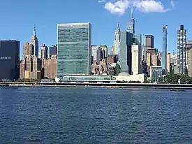 Viewed across the East River from Roosevelt Island in 2021; from left to right: the Secretariat, Conference, and General Assembly buildings. In the background (from left to right) are the Empire State Building, the Chrysler Building, One Vanderbilt, and other skyscrapers.