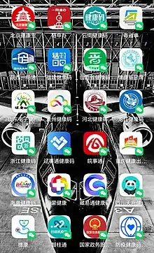 Health Code (Chinese: 健康码, Jiànkāngmǎ) is a type of application used during COVID-19[1] in mainland China. It was used as an e-passport that reports if the user has been in an area with current cases of infection. An applicant provides information such as travel history, residence, and medical records. The application will then generate a QR code that identifies the individual's risk level as red, yellow, or green.[2] As of April 2020, over 200 cities and 20 provinces employed health code supported by Alipay. There are a wide range of health codes run by different localities.