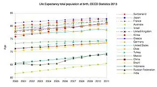 - ↑ "OECD.StatExtracts, Health, Health Status, Life expectancy, Total population at birth, 2011" (Online Statistics). OECD.Stats. OECD's iLibrary. 2013. Retrieved 22 November 2013.