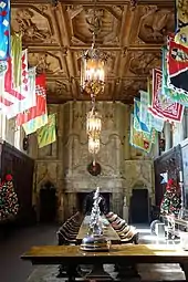 The refectory was the only dining room in the castle, and was built between 1926 and 1927.[172] The choir stalls which line the walls are from the La Seu d'Urgell Cathedral in Catalonia[177] and the silk flags mounted on the walls are Palio banners from Siena.[lower-alpha 20][179] Hearst originally intended a "vaulted Moorish ceiling" for the room but, finding nothing suitable, he and Morgan settled on the Italian Renaissance example, dating from around 1600, which Hearst purchased from a dealer in Rome in 1924.[180] Victoria Kastner considered that the flat roof, with life-size carvings of saints, "strikes a discordant note of horizontality among the vertical lines of the room".[181] The style of the whole is Gothic, in contrast to the Renaissance approach adopted in the preceding assembly room.[159] The refectory is said to have been Morgan's favorite interior within the castle.[182] The design of both the refectory and the assembly room was greatly influenced by the monumental architectural elements, especially the fireplaces and the choir stalls used as wainscoting, and works of art, particularly the tapestries, which Hearst determined would be incorporated into the rooms.[183] The central table provided seating for 22 in its usual arrangement of two tables, which could be extended to three or four, on the occasion of larger gatherings.[184] The tables were sourced from an Italian monastery[185] and were the setting for some of the best pieces from Hearst's collection of silverware. One of the finest is a wine cooler dating from the early 18th century and weighing 14.2 kg by the Anglo-French silversmith David Willaume.[186]