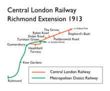 The station was to have been built on the CLR's planned underground extension from Shepherd's Bush to Gunnersbury proposed to parliament in November 1912.[1] The extension was to continue on the London and South Western Railway (L&SWR) surface tracks to Richmond already used by the District Railway (DR). The station would have been between Gunnersbury to the west and Turnham Green to the east.[2]