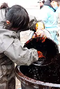 On 14 December, the oil balls had arrived at Anmyeon-do[10] (安眠島; Anmyeon Island), resulting in at least five beaches being contaminated with large tar lumps. It was believed that the oil belt was not going to go down to Anmyeon-do, but bad, windy weather was responsible for it. On 15 December, the tar lumps had also floated to Boryeong (mostly around Wonsan Island[11] and Sapsi Island of Boryeong) and to Gunsan in North Jeolla province as well.