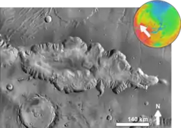 The walls of Hebes Chasma weather differently than the slopes on the mesa on its floor. Also, studies of the thermal inertia suggest that the mesa and the walls of the canyon are made of different substances. Thermal inertia is how long the surface holds heat. For example, rocky areas will stay warmer than dust at night. One popular idea that explains the difference between the depression's walls and the mesa slopes is that the mesa was formed from material that accumulated in a lake.[2]