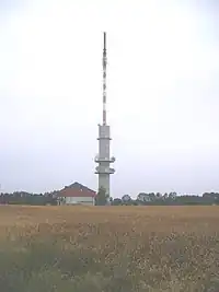 Hegyhátsál TV Tower is a 117-meter tall transmission tower near Hegyhátsál at Hungary at 46°57'21N and 16°39'08E. Hegyhátsál TV tower is a tower is one of the few partially guyed towers as it consists of a concrete tower as basement with a guyed mast on its top. Hegyhátsál TV Tower is not only used for FM- and TV-broadcasting, it carries also instruments for measuring the concentration of carbon dioxide. Therefore, it carries corresponding devices 10, 48, 82 and 115 metres above ground. At the uppermost measuring sites also instruments for measuring wind speed, wind direction, temperature and air humidity are mounted on a 4.4 metre long arm.