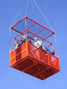 This type of basket was tested by the Air National Guard in 2006, and were found to be quite functional. Guard personnel tested out a basket which could fit up to 15 people, at the Air National Guard-Air Force Reserve Command Test Center at Tucson, Ariz. The basket which was tested is known as the Heli-Basket, is 4-and-a-half foot by 8-and-a-half feet, and hangs on a 125-foot cable below an HH-60G Pave Hawk helicopter. it was invented by John Tollenaere, of the company Precision Lift, Inc.[2]