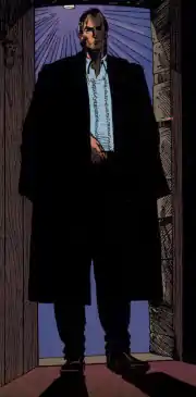 John Constantine, the main character of Hellblazer, was portrayed as a kind of confidence man and occult detective who did morally questionable things, arguably for the greater good.[8] He usually triumphed through guile, deceit, and misdirection, but often made more enemies in the process than he defeated. Indeed, it was a common theme in the book that Constantine was unable to effect any lasting change or enjoy unequivocal victories. While sometimes striving for the good of mankind, Constantine was often manipulative and a dangerous person to have as a friend, as the lives and souls of those around him became perilously involved in his misadventures. He took pains to protect himself from direct attacks, but his friends and relatives were often endangered in order to strike at him. The spirits of deceased friends haunted him, individually or as an entourage of ghosts.[1]