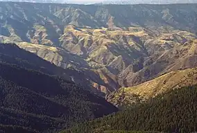 The Oregon portion of Hells Canyon Wilderness is characterized by two steep breakland areas in excess of 60 percent paralleling the Snake River. These are separated by a benchland at mid-elevation between the river and canyon rim between Saddle Creek and Dug Bar. The dominant vegetation is native bunchgrasses and shrubs. Trees are scattered throughout the Oregon side of the Wilderness, but concentrated on north-facing slopes and in stream bottoms - primarily ponderosa pine and Douglas fir. The three topographic provinces are dissected by many drainages including Saddle, Temperance, Salt, and Sluice Creeks.[5]
