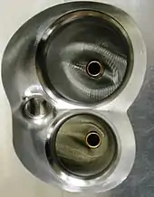 Many of today's engines use active combustion chambers designed to tumble and swirl the fuel/air mix within the chamber for the most efficient combustion event possible.[21] These active chambers usually look like kidney beans or two merged small 'hemi' areas surrounded by flat quenching areas over the pistons.[22]