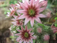 Hen and chicks (also known as hen-and-chickens, or hen-widdies in the southern United States) is a common name for a group of small succulent plants. They belong to the flowering plant family Crassulaceae, native to southern Europe and northern Africa. The plants grow close to the ground with leaves formed around each other in a rosette, and propagating by offsets. The "hen" is the main, or mother, plant, and the "chicks" are a flock of offspring,[1] which start as tiny buds on the main plant and soon sprout their own roots, taking up residence close to the mother plant.