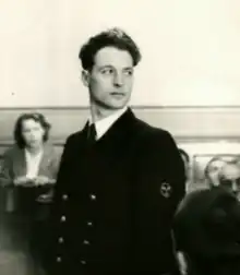 Martin returned stateside, as requested, in July 1949 to be stationed at the naval dockyard in Toulon.[5] He continued his efforts against what he called the imperial venture in the Indochina war in inciting his fellow soldiers on base, handing out pamphlets, and even targeted new recruits to turn their opinion against the military's efforts in the Indochina War.[5] With the new law in effect in 1950, Martin was among some of the firsts arrests in March 1950, including the equally notorious Raymonde Dien; all were taken in for demoralizing efforts against the military and the government of France.[8] As it follows, Martin was arrested by the military authorities and held until his hearing by a military tribunal in Toulon in October 1950 under the charges of distribution of anti war pamphlets and the attempted sabotage of the Dixmude aircraft carrier.[10][8] His charge for the sabotage of the Dixmude was shared with 20-year-old Charles Heimburger as they were second master mechanics that could have had access to the ship to throw a handful of emery stone in the oil bath of the propeller shaft of Dixmude.[11][12] The morning of his trial, there were people everywhere around the courthouse.[13] People were coming in on buses, people were standing on chairs giving impromptu speeches, the city was covered in graffiti and posters, even an effigy of Martin himself. Walkouts were happening at workshops all over the city, car parades, rallies and open air meetings, all for the purpose of political awareness and freeing Henri Martin.[13] At 9 am that morning, a 24-year-old Martin arrived, surrounded by gendarmes, dressed in his dark sailor's uniform, and was described as wearing a young and moreover friendly face.[13][14] When he entered the courtroom, though it was packed with lawyers, journalists, and witnesses, there was an immediate and impressive silence.[13] Martin's father, who had come in from Cher, sat on the front row bench with Martin's sister and fiancé (there was also the noticeable presence of Communist activists.)[13] Even with the clear lack of evidence and Martin vehemently denying the latter accusation of the Dixmude, though admitting to the former, Martin was sentenced to five years in prison and dishonorably discharged from the French Navy.[10] The judgement was ultimately quashed but Martin appeared again in July 1951 before the Brest maritime tribunal, which pronounced the same sentence against him.[11]