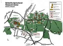 - ↑ "Beltsville Agricultural Research Center: Beltsville, MD." U.S. Department of Agriculture. Retrieved on September 2, 2018. "10300 Baltimore Avenue Bldg. 003, Rm. 231, BARC-West Beltsville, MD 20705"