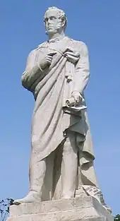 Despite his popular reputation he was hesitant in 1831 about aiding the Sultan of Turkey, who was under threat from Muhammad Ali, the pasha of Egypt.[52] Later, after Russian successes, in 1833 and 1835 he made proposals to afford material aid, which were overruled by the cabinet. Palmerston held that "if we can procure for it ten years of peace under the joint protection of the five Powers, and if those years are profitably employed in reorganizing the internal system of the empire, there is no reason whatever why it should not become again a respectable Power" and challenged the metaphor that an old country, such as Turkey should be in such disrepair as would be warranted by the comparison: "Half the wrong conclusions at which mankind arrive are reached by the abuse of metaphors, and by mistaking general resemblance or imaginary similarity for real identity."[53] However, when the power of Muhammad Ali appeared to threaten the existence of the Ottoman dynasty, particularly given the death of Sultan Mahmud II on 1 July 1839, he succeeded in bringing the great powers together to sign a collective note on 27 July pledging them to maintain the independence and integrity of the Turkish Empire in order to preserve the security and peace of Europe. However, by 1840 Muhammad Ali had occupied Syria and won the Battle of Nezib against the Turkish forces. Lord Ponsonby, the British ambassador at Constantinople, vehemently urged the British government to intervene.[49] Privately, Palmerston explained his views on Muhammad Ali to Lord Granville thus: "Coercion of Mehemet Ali by England if war broke out might appear partial and unjust; but we are partial; and the great interests of Europe require that we should be so....No ideas therefore of fairness towards Mehemet ought to stand in the way of such great and paramount interests."[54][55] Having closer ties to the pasha than most, France refused to be a party to coercive measures against him despite having signed the note in the previous year.[56]