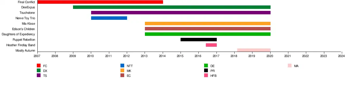 Alongside his work with other musicians such as Alan Reed[36] (Pallas[37]) and with Alan's live band The Daughters of Expediency,[38] Morpheus Rising[39][40] and Edison's Children[41] (a project set up by Pete Trewavas[32] and Eric Blackwood featuring Rick Armstrong, the son of the 1st Man on the Moon Neil Armstrong). He is also a well–known session musician (for both live and studio work), regularly working with established musicians both in the UK and from around the globe. He was also recently invited to play with Guy Manning's Damanek,[42] at Summer's End 2016.