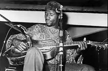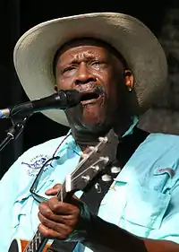 Mahal leads with his thumb and middle finger when fingerpicking, rather than with his index finger as the majority of guitar players do. "I play with a flatpick," he says, "when I do a lot of blues leads."[7] Early in his musical career Mahal studied the various styles of his favorite blues singers, including musicians like Jimmy Reed, Son House, Sleepy John Estes, Big Mama Thornton, Howlin' Wolf, Mississippi John Hurt, and Sonny Terry. He describes his hanging out at clubs like Club 47 in Massachusetts and Ash Grove in Los Angeles as "basic building blocks in the development of his music."[31] Considered to be a scholar of blues music, his studies of ethnomusicology at the University of Massachusetts Amherst would come to introduce him further to the folk music of the Caribbean and West Africa. Over time he incorporated more and more African roots music into his musical palette, embracing elements of reggae, calypso,[12] jazz, zydeco, R&B, gospel music, and the country blues—each of which having "served as the foundation of his unique sound."[3] According to The Rough Guide to Rock, "It has been said that Taj Mahal was one of the first major artists, if not the very first one, to pursue the possibilities of world music. Even the blues he was playing in the early 70s – Recycling The Blues & Other Related Stuff (1972), Mo' Roots (1974) – showed an aptitude for spicing the mix with flavours that always kept him a yard or so distant from being an out-and-out blues performer."[12] Concerning his voice, author David Evans writes that Mahal has "an extraordinary voice that ranges from gruff and gritty to smooth and sultry."[1]