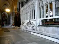 - ↑ Identification per Orme, Nicholas, "Whose Body?", published in "The Cathedral Cat, Stories from Exeter Cathedral", 2008, p.25, who identifies Raleigh as the left-most (westernmost) of two similar effigies. Pevsner, Buildings of England: Devon, 2004, p.381 identifies him as the right-most