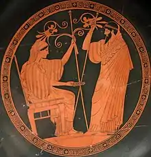 A prophecy stated that a son of the sea-nymph Thetis, with whom Zeus fell in love after gazing upon her in the oceans off the Greek coast, would become greater than his father.[74] Possibly for this reason,[75] Thetis was betrothed to an elderly human king, Peleus son of Aeacus, either upon Zeus' orders,[76] or because she wished to please Hera, who had raised her.[77] All the gods and goddesses as well as various mortals were invited to the marriage of Peleus and Thetis (the eventual parents of Achilles) and brought many gifts.[78] Only Eris, goddess of discord, was not invited and was stopped at the door by Hermes, on Zeus' order. She was annoyed at this, so she threw from the door a gift of her own:[79] a golden apple inscribed with the word καλλίστῃ (kallistēi, "To the fairest").[80] Aphrodite, Hera, and Athena all claimed to be the fairest, and thus the rightful owner of the apple.