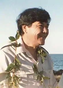Herbert Kawainui Kāne (June 21, 1928 – March 8, 2011), considered one of the principal figures in the renaissance of Hawaiian culture in the 1970s, was a celebrated artist-historian and author with a special interest in the seafaring traditions of the ancestral peoples of Hawaiʻi. Kāne played a key role in demonstrating that Hawaiian culture arose not from some accidental seeding of Polynesia, but that Hawaiʻi was reachable by voyaging canoes from Tahiti able to make the journey and return. This offered a far more complex notion of the cultures of the Pacific Islands than had previously been accepted.[2] Furthermore, he created vivid imagery of Hawaiian culture prior to contact with Europeans, and especially the period of early European influence, that sparked appreciation of a nearly forgotten traditional life. He painted dramatic views of war, exemplified by The Battle at Nuʻuanu Pali, the potential of conflicts between cultures such as in Cook Entering Kealakekua Bay, where British ships are dwarfed and surrounded by Hawaiian canoes, as well as bucolic quotidian scenes and lush images of a robust ceremonial and spiritual life, that helped arouse a latent pride among Hawaiians during a time of general cultural awakening.[1]