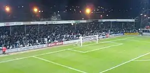 The ground itself changed little since the mid-1970s and was largely outdated and in need of urgent redevelopment, with the Blackfriars End failing a safety inspection in July 2009.[30] The terraced end had fallen into a state of disrepair in recent years which steadily reduced the stadium capacity from nearly 9,000 to reportedly 7,100, although the capacity was officially confirmed as 7,700 in November 2007.[31] Improvements were made in later years to ensure the ground met Football League standards; including new floodlights, dressing rooms and barriers on the terraces. The pitch itself was also completely relaid for the 2007–08 season,[32] with a new sprinkler system installed for the 2008–09 season.[33] In 2013, the club said the capacity of Edgar Street was 5,966, but in 2014, the club only had a safety certificate to allow 1,000 spectators.